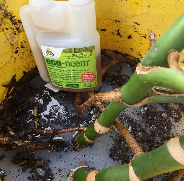 - Prepare a Neem oil dunk to drench the plants and water it through, ensure the water comes out of drainage holes. Only subject the plant to a dunk if the weather and soil conditions are favourable for heavy watering.
